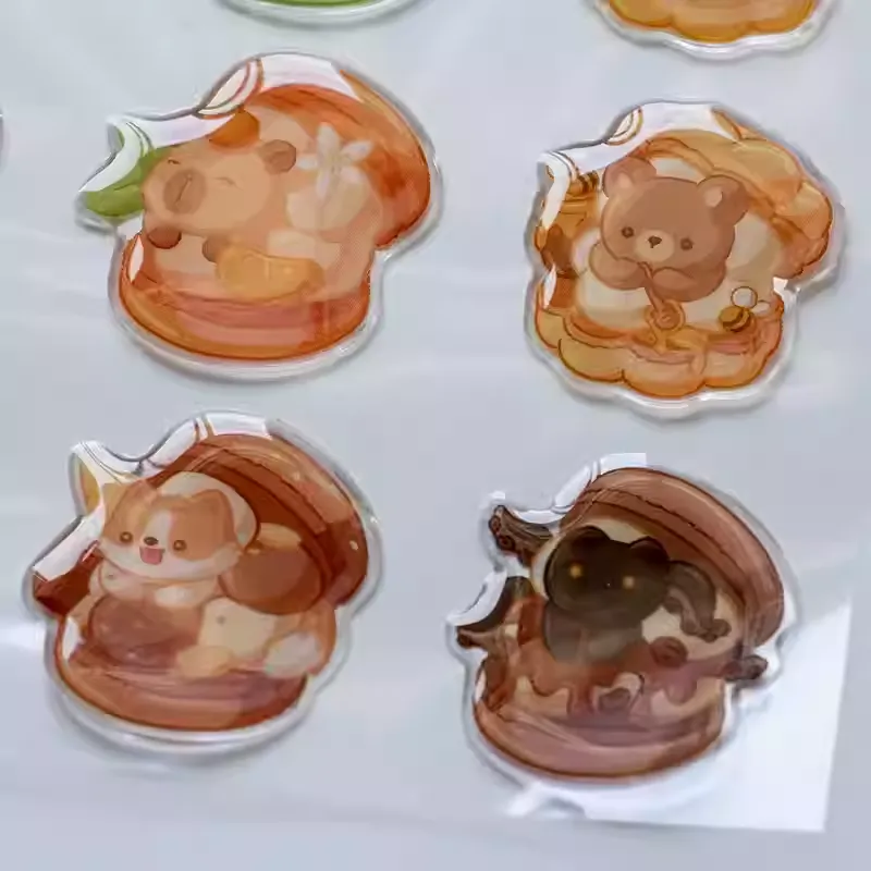 कार्टून एपॉक्सी स्टिकर एक चिकनी, चमकदार चमक को बचाता है जो रंग जीवंतता और स्पष्टता को बढ़ाता है। यह चमकदार सतह प्रकाश को दर्शाती है, जिससे मुद्रित डिजाइन अधिक ज्वलंत और पेशेवर दिखाई देते हैं।