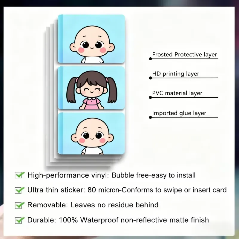 क्रेडिट कार्ड की त्वचा आमतौर पर पीवीसी प्लास्टिक जैसी सामग्रियों से बनाई जाती है, जो पतली होती है, चिपकाने और हटाने में आसान होती है, और स्थायित्व और लंबे समय तक चलने वाली उपस्थिति सुनिश्चित करने के लिए इसमें अक्सर जलरोधक और खरोंच-प्रतिरोधी मैट सतह होती है। यह जलरोधक, आंसू प्रतिरोधी और उच्च-रिज़ॉल्यूशन यूवी प्रिंटिंग के साथ संगत होती है।