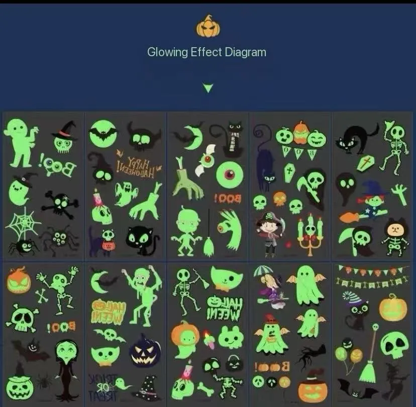 हैलोवीन नाइट ग्लो टैटू स्टिकर एक रचनात्मक सजावटी आइटम है जिसे विशेष रूप से हेलोवीन उत्सव के लिए डिज़ाइन किया गया है। यह इको-फ्रेंडली ग्लो-इन-द-डार्क इंक मटेरियल से बना है और ट्रेंडी टैटू पैटर्न डिज़ाइन को जोड़ती है। दिन के दौरान, यह एक प्राकृतिक रंग या काले टैटू प्रभाव पेश कर सकता है, और रात में, यह शांत फ्लोरोसेंट प्रकाश का उत्सर्जन कर सकता है, जिससे आप आसानी से हैलोवीन पार्टियों, स्ट्रीट परेड और थीम्ड घटनाओं पर ध्यान का केंद्र बन सकते हैं। चाहे आप एक डरावना और विचित्र भूत की तरह डिजाइन की तलाश में हों या एक रहस्यमय और रोमांटिक अंधेरे वातावरण को पसंद करें, आप अपने पसंदीदा विकल्प को समृद्ध विविधता के पैटर्न के बीच पा सकते हैं। आप टैटू के दर्द और स्थायित्व को सहन किए बिना आंख को पकड़ने वाले हेलोवीन-थीम वाले संगठन का आनंद ले सकते हैं।