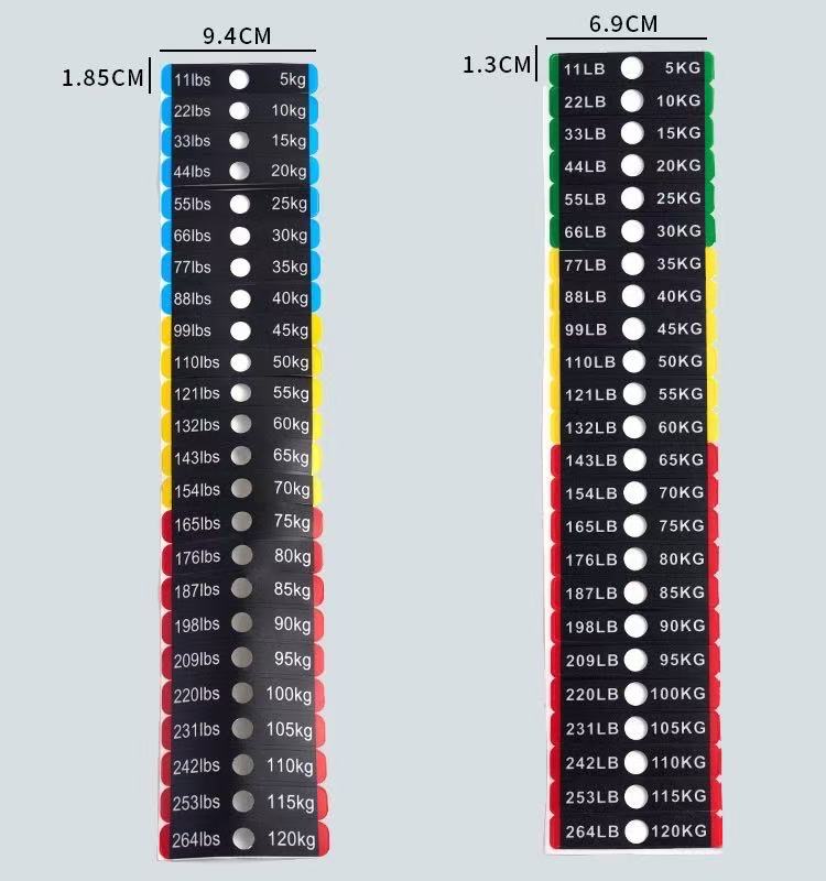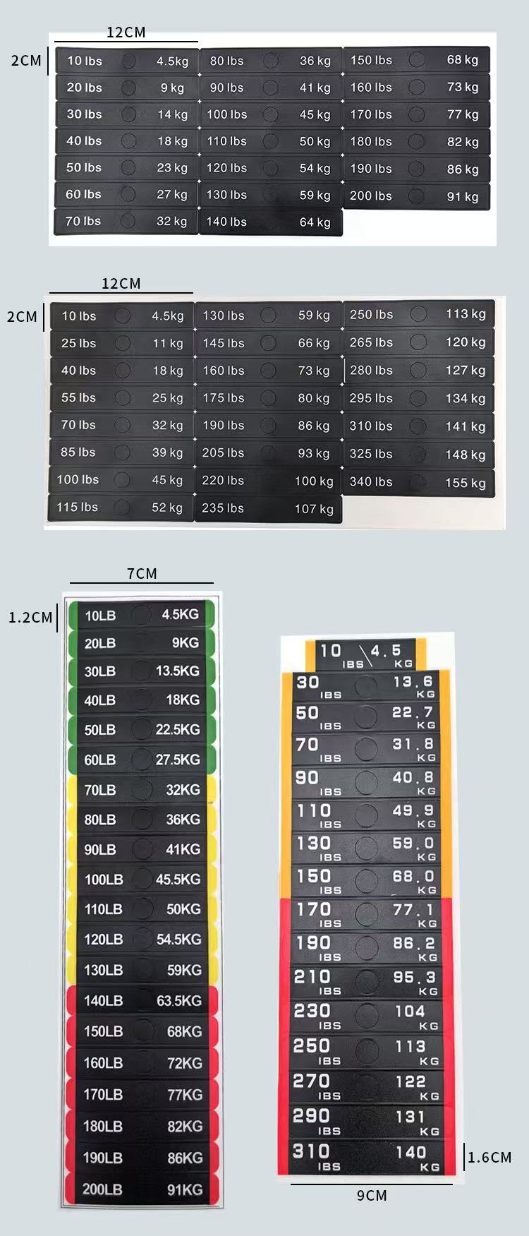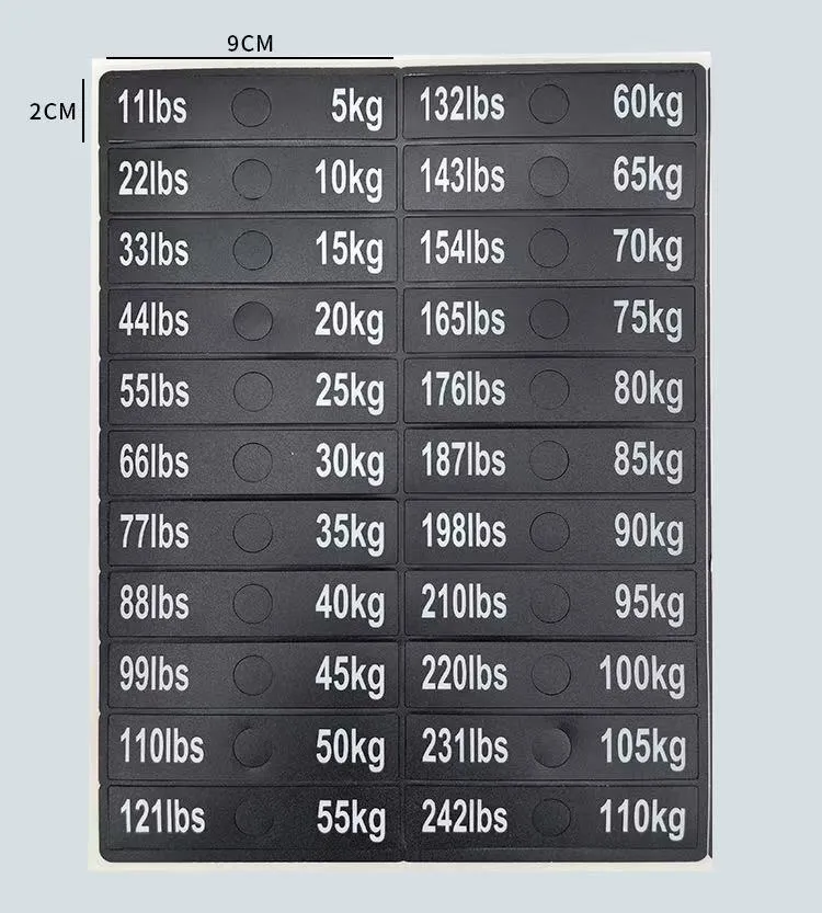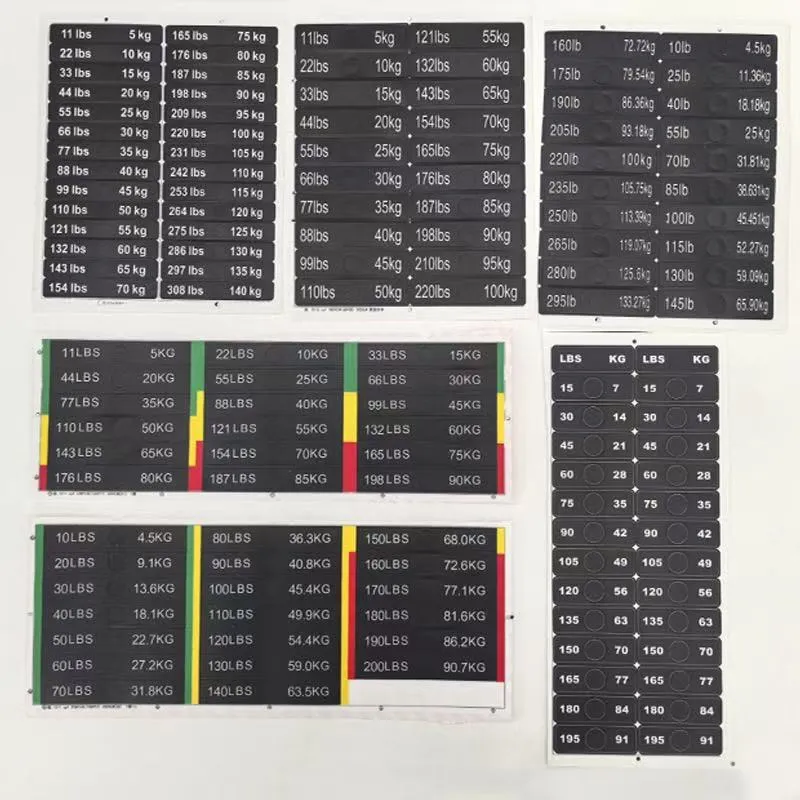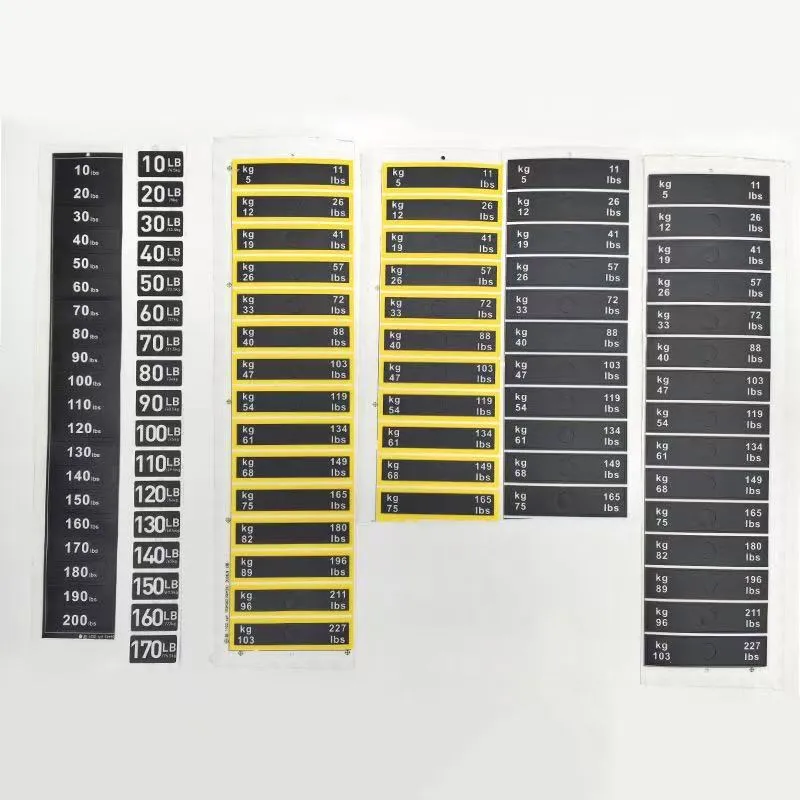 प्रीमियम-गुणवत्ता वाली सामग्रियों से तैयार किए गए, ये स्टिकर दैनिक उपयोग के दौरान टूट-फूट से प्रतिरोधी हैं। मुद्रित पाठ फिटनेस उपकरण के पूरे सेवा जीवन के दौरान तीव्र और फीका-मुक्त रहता है, जिससे लंबे समय तक चलने वाला प्रदर्शन सुनिश्चित होता है। स्पष्ट वजन चिह्नों के साथ, उपयोगकर्ता अपनी फिटनेस प्रगति को बेहतर ढंग से ट्रैक कर सकते हैं और प्रशिक्षण लक्ष्य निर्धारित कर सकते हैं, वैज्ञानिक प्रशिक्षण प्रबंधन प्राप्त कर सकते हैं।