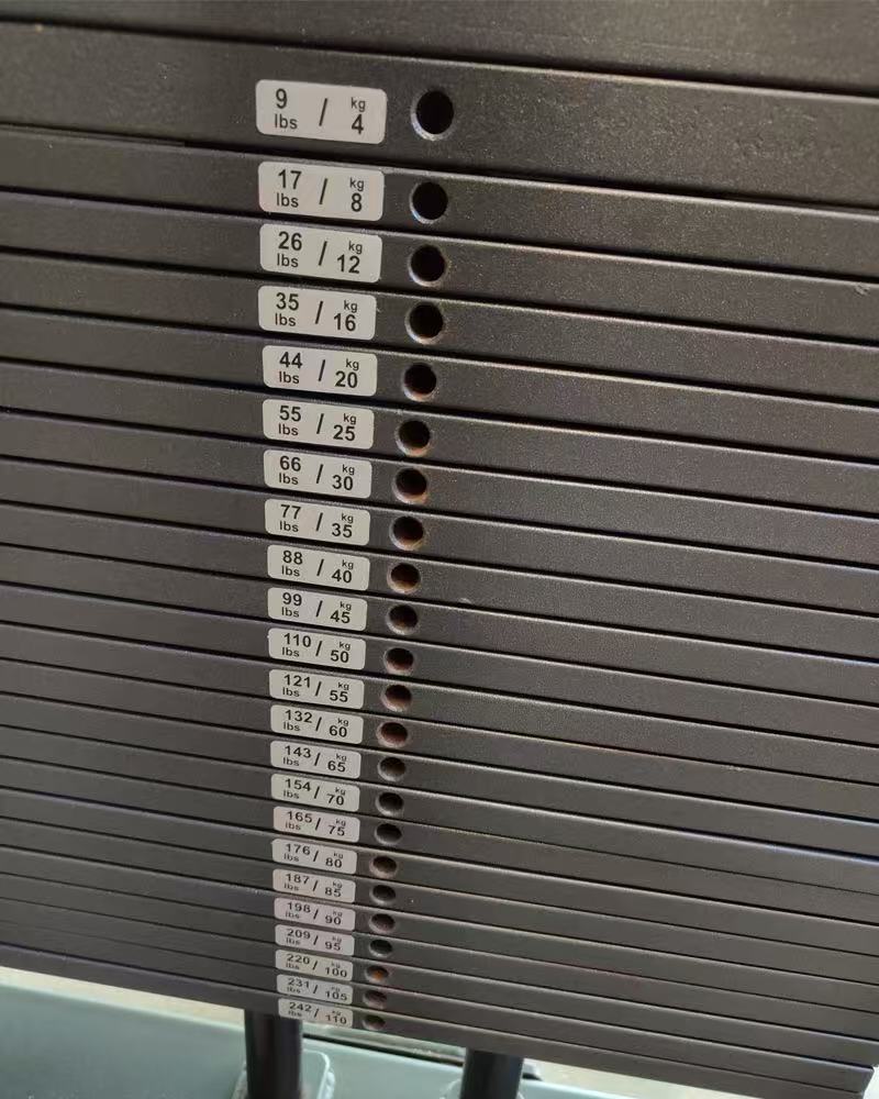 प्रत्येक स्टिकर को वजन मूल्यों के साथ स्पष्ट रूप से चिह्नित किया जाता है, जिससे उपयोगकर्ता अपने प्रशिक्षण की तीव्रता के लिए उपयुक्त वजन ब्लॉकों को तुरंत पहचानने और चुनने में सक्षम होते हैं, और वर्कआउट के दौरान बार-बार वजन करने से बचते हैं।