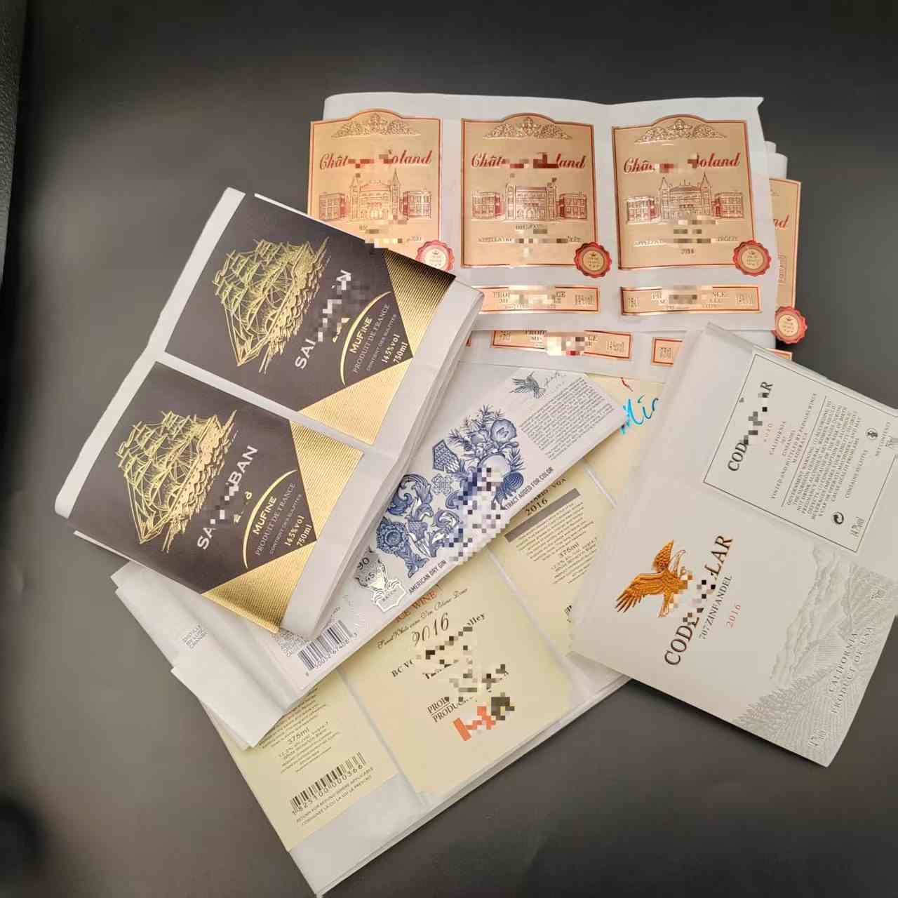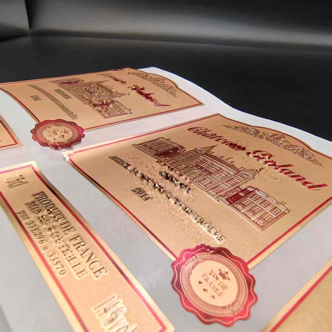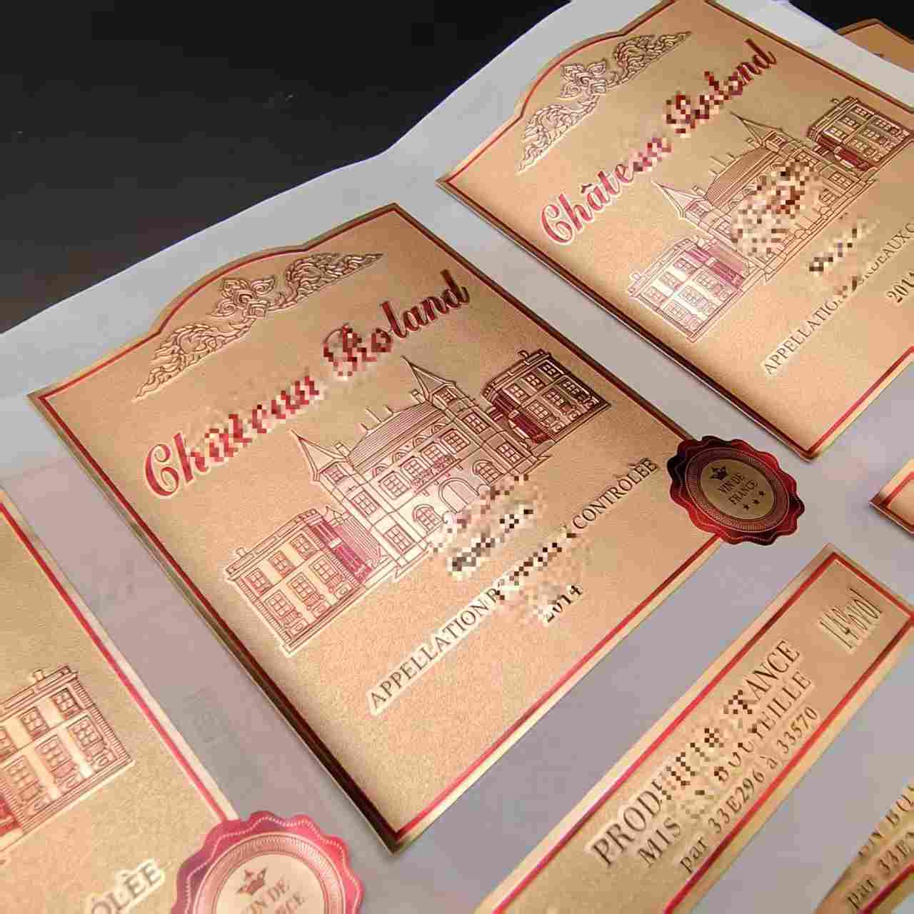 वाइन बोतल स्टिकर उच्च गुणवत्ता वाले पीवीसी सामग्री से बने होते हैं, कस्टम पीवीसी वाटरप्रूफ गिल्डेड वाइन लेबल में उत्कृष्ट पानी और नमी प्रतिरोध होता है।